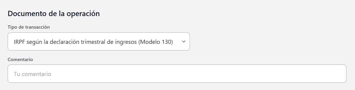 NO OLVIDES registrar tus pagos de IRPF cada trimestre que la Agencia Tributaria carga en tu cuenta bancaria. Necesitas registrar esos importes añadiendo una transacción en Gastos. El tipo de transacción que debes seleccionar se llama “IRPF según declaración trimestral de ingresos (Modelo 130)”. Menú → Gastos → IRPF → IRPF según declaración trimestral de ingresos (Modelo 130). En esta transacción, después de la presentación del Modelo 130 del IRPF en cada trimestre, debes registrar el importe positivo (si lo hay) que figure en la casilla 19 del Modelo 130.