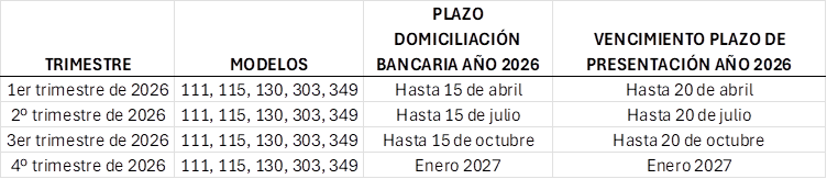 A continuación, se detallan los plazos generales y los plazos con domiciliación bancaria para cada modelo correspondientes al año 2026.