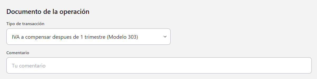 Para registrar el resultado negativo de la casilla 71 necesitas ir al menú Ingresos → tipo de transacción “IVA – cuotas a compensar – Modelo 303”. Pero, por favor, introduce el importe en positivo. Así, si después del primer trimestre tenías “-150” en la casilla 71, introduce “150” en la transacción mencionada.